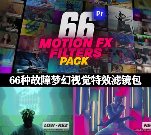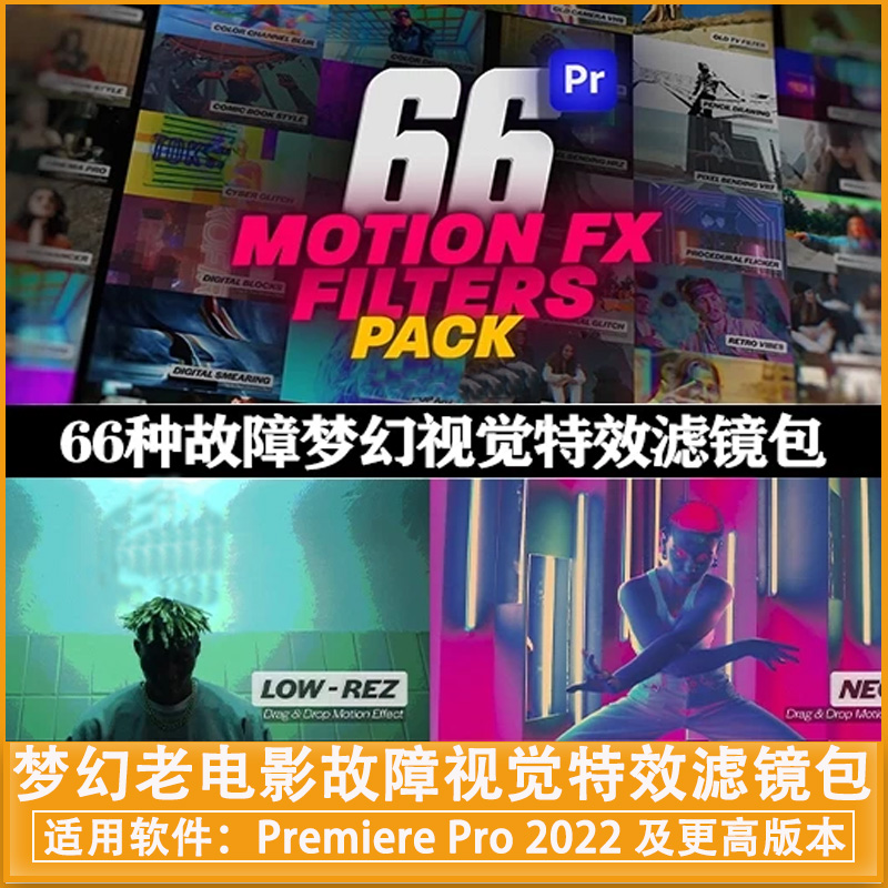 板包含66种不同风格的专业运动效果滤镜,如VHS、CRT、故障(Glitch)、梦幻(Dreamy)、老电视(Old TV)、音乐视频效果等。