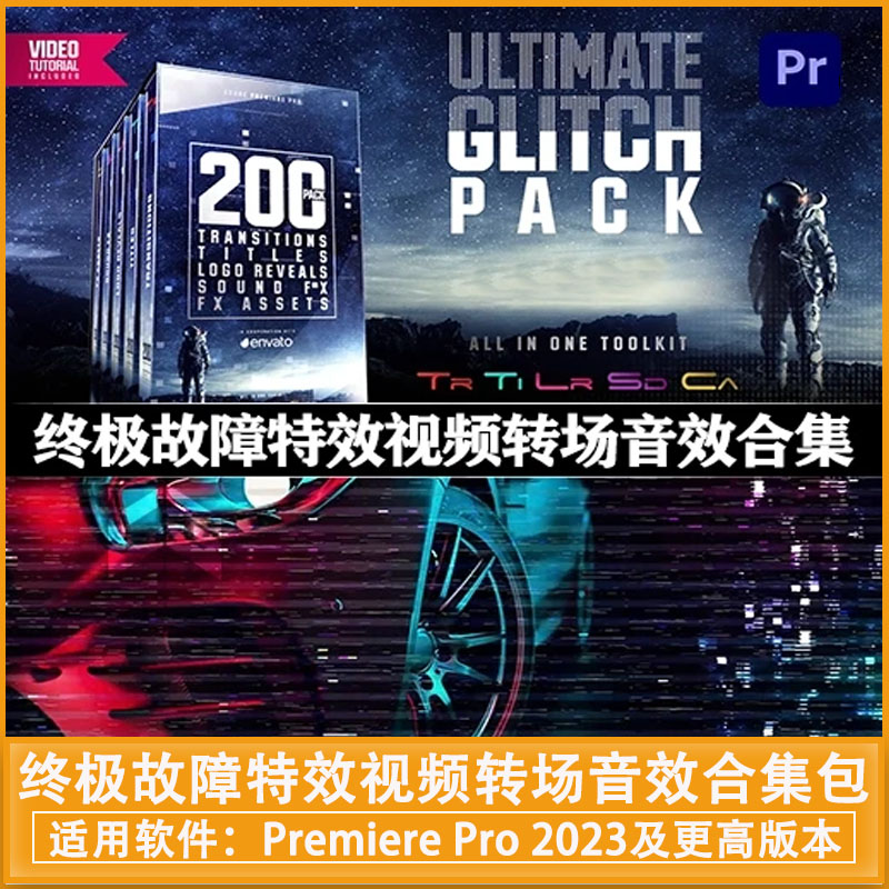 这是一个适用于Premiere Pro的终极故障特效包,包含转场、标题、徽标揭示和音效。包含超过200种创意素材,包括50种故障转场、10多个故障标题动画、8个徽标揭示、100多个音效以及30多个其他创意素材