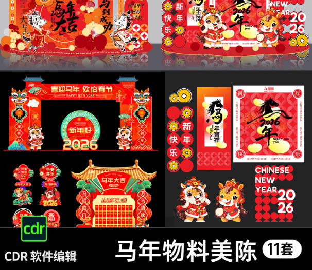 11款原创春节美陈矢量源文件,CorelDRAW专用CDR格式,专为2026马年定制。含中空吊幔、中庭DP、橱窗贴、扶梯侧旗、打卡背板全套场景,PANTONE中国红+鎏金配色,矢量刀版含出血,3分钟替换LOGO与活动信息,即可输出喷绘、KT板、亚克力、灯箱片,商场、超市、地产案场即装即用。