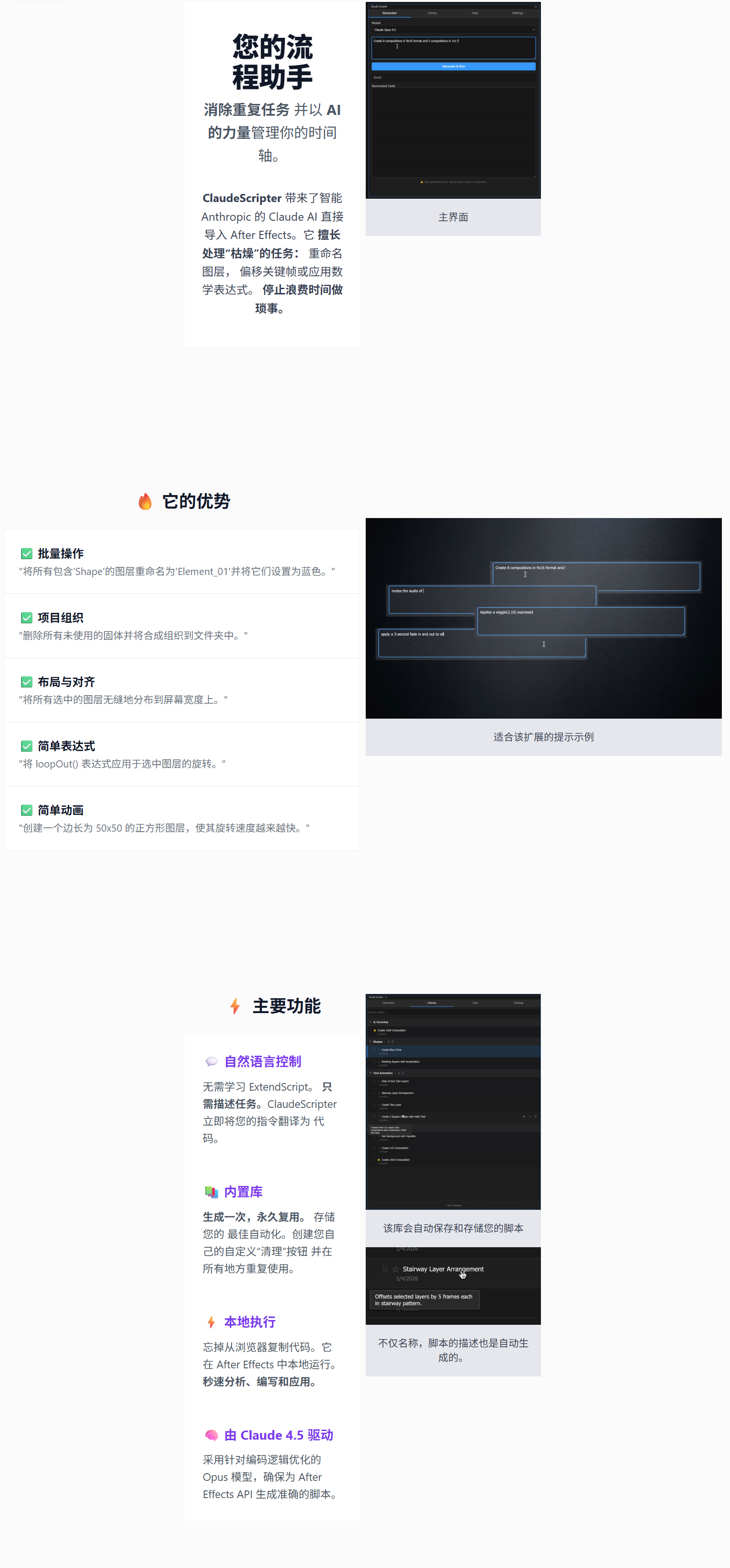 Claude Scripter是一款基于AI的Adobe After Effects脚本辅助插件,通过自然语言指令即可自动生成、执行并保存ExtendScript(JSX)代码,将繁琐、重复的AE操作彻底自动化。