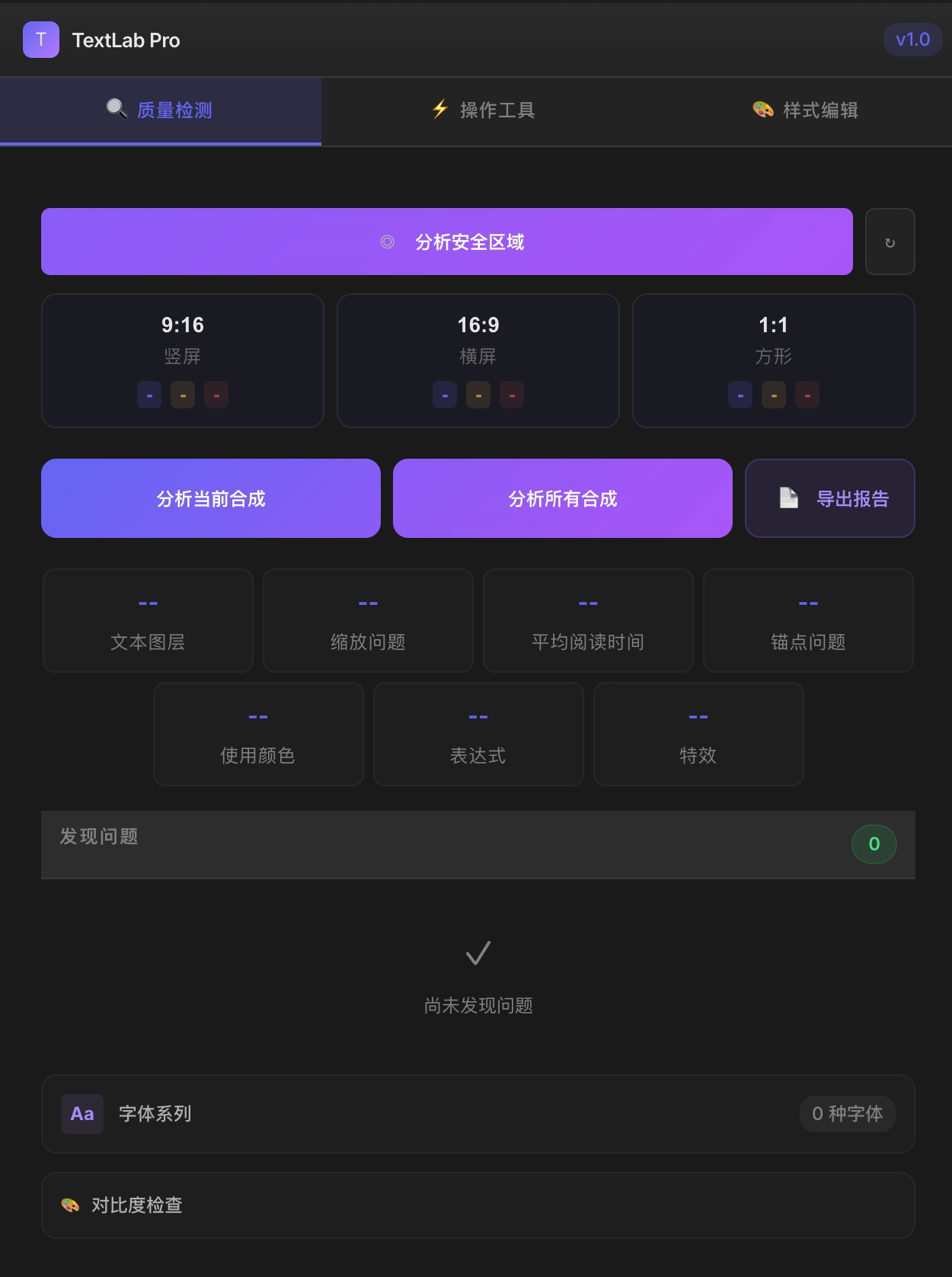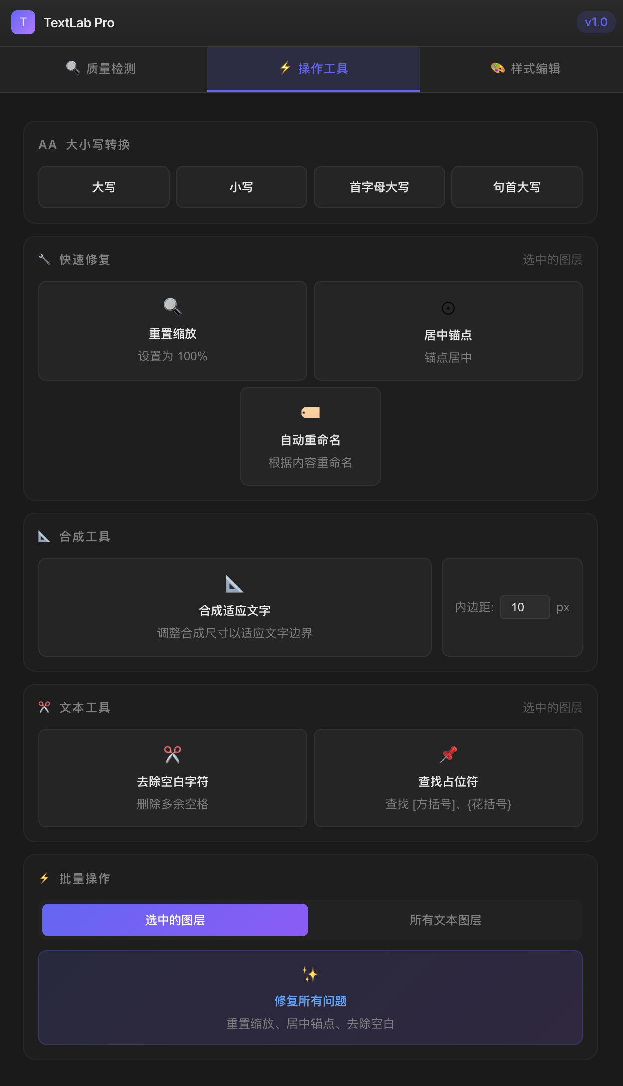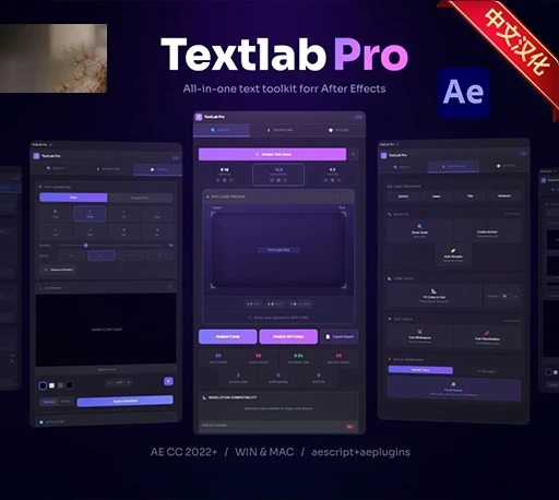Textlab Pro是一款集文字分析、批量编辑、动画与样式管理于一体的After Effects专业文本工具面板。它可自动检测安全区、修复缩放与锚点问题、批量修改多合成文字内容,并提供实时预览动画与丰富样式预设。无论是社交视频、品牌动画还是动态图形项目,Textlab Pro都能大幅提升文字制作效率,让排版、动画和风格统一变得轻松而精准。