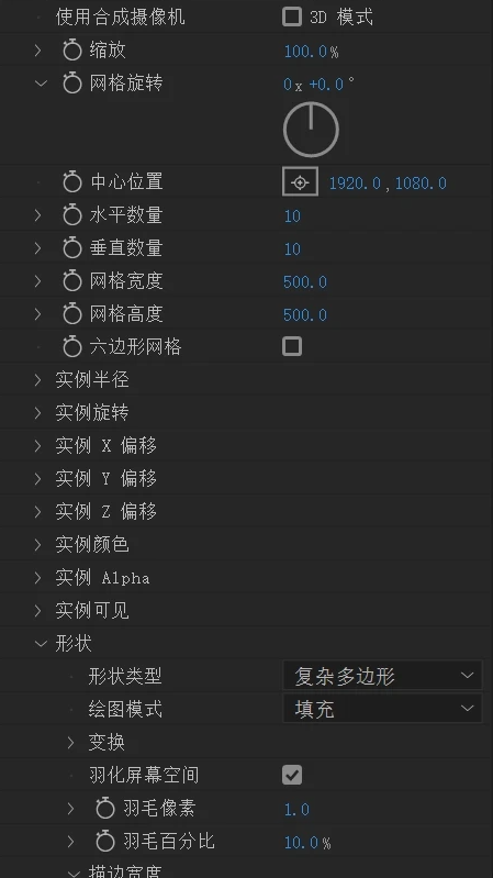 实例 :网格的每个点都由形状的副本表示并称为实例。实例有很多动画参数:半径、角度、位置偏移、颜色、Alpha。