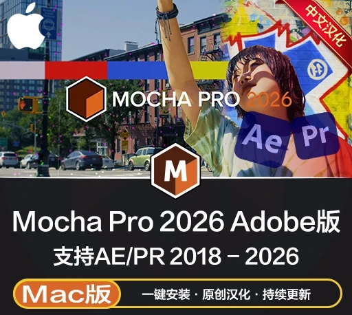提供的是Mac苹果中文汉化Mocha Pro 2026 For Adobe插件版下载,支持AE和PR。Mocha Pro 2026是一款世界知名的软件和插件,用于平面运动跟踪、3D 跟踪、动态观察、对象移除、图像稳定和 PowerMesh有机扭曲跟踪。新功能包括了提升的3D跟踪和相机解算、增强的跟踪和描边工具、性能优化、新的导出和集成选项、选择工具的新功能、图层描边工具、跟踪工具的更新以及扩展的渲染选项。这些更新使得用户可以更高效地进行复杂的视觉效果制作工作。