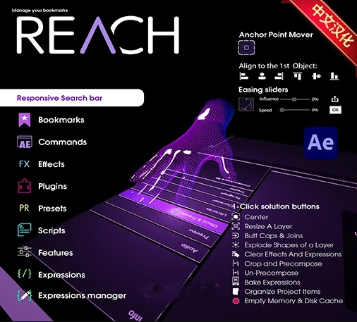 使用Reach AEssential工具包提高After Effects效率,Reach使您可以轻松访问AE中的各种功能,包括命令、效果、预设、扩展、插件和所有脚本。还有预写表达式、表达式编辑器、脚本助手和表达式存储功能。Reach具有独特的功能,例如 用于管理图层、关键帧、颜色、音频同步、合成、优化、裁剪、反弹、木偶图钉、相机等的工具。 响应式界面还包括内置功能,例如锚点管理器、对齐工具、缓动滑块和快捷方式等。