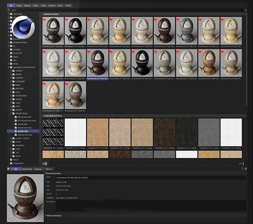 A whole set of Corona | Cinema 4D materials, in a Cinema 4D assets database, that allows easy access and use of material libraries.Choose from hundreds of unique, highest quality bitmap-based and procedural materials to drag and drop into your Cinema 4D scene.All materials offered on SIGER STUDIO come with the relevant texture maps as needed.These materials work only in the Chaos Corona | C4D renderer.
