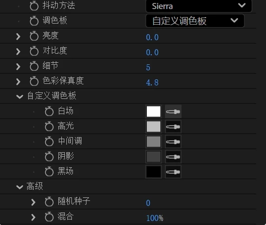 插件内置多种抖动算法与11种预设色板,并支持自定义颜色组合,用户可以轻松打造从强烈像素风到细腻纹理噪点的不同视觉风格。同时提供细节、混合等参数控制,既能快速出效果,也能深入微调,适合用于复古风视频、故障艺术、音乐可视化等创作场景。