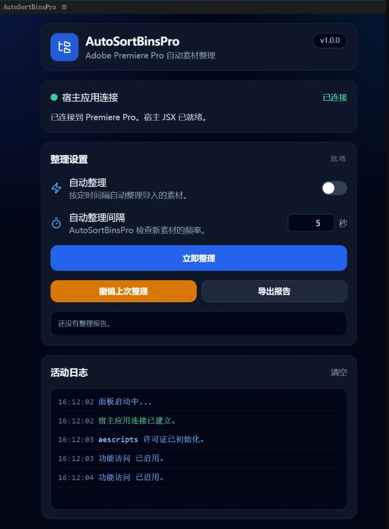 AutoSortBinsPro是一款专为Adobe Premiere Pro打造的高效项目管理扩展插件,能够自动对导入的素材进行分类与整理,将杂乱的项目面板快速转变为结构清晰、规范统一的工作环境。通过一键整理或后台自动排序功能,无需手动拖拽和分类,即可将视频、音频、图形等素材智能归档到对应的Bin文件夹中,大幅提升项目整洁度与查找效率。无论是个人创作者还是团队协作,AutoSortBinsPro都能有效减少重复整理时间,让剪辑流程更加流畅高效。